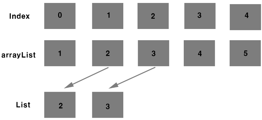 ▼ 15 Line에서 arrayList로부터 index 범위 1~3에 해당하는 element들을 List 형태로 반환받아서 출력하는 예제입니다. 주의할 것은 index 범위가 1~3까지 지정이 되었지만 toIndex 앞까지에 해당하는 element까지만 반환한다는 것입니다.