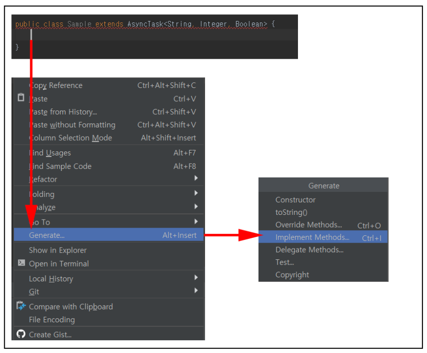 ▼ Sample 클래스는 AsyncTask 라는 추상클래스를 상속받는 클래스입니다. 그런데 안드로이드 스튜디오에서 오류로 처리하고 있는데 이유는 AsyncTask를 상속받으면 반드시 재정의 해야 할 함수를 구현하지 않았기 때문입니다. 지금같은 경우는 오류를 살펴보면 doInBackground() 함수만 재정의해주면 됩니다. 만약 재정의 해야 할 함수가 많다면 일일이 개발자가 코드를 입력해야합니다.