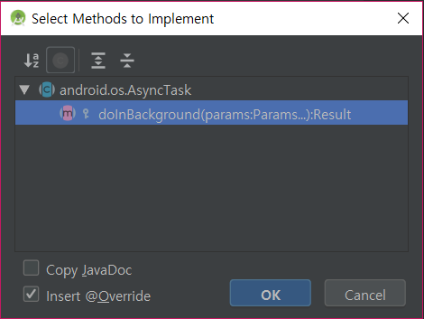 ▼ 그러면 위와 같이 창이 하나가 활성화됩니다. AsyncTask 추상 클래스를 상속받으면 반드시 재정의해야 할 함수 목록을 보여주는 화면으로 자동 코드를 추가하고자 하는 함수를 선택 후 OK 버튼을 클릭합니다.