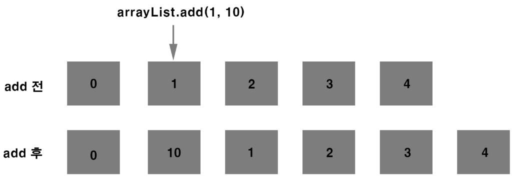 ▼ 위 예제에서 15번 라인이 추가되었습니다. 마찬가지로 add 메소드를 사용하였는데 인자로 index를 추가로 넘기고 있습니다. ArrayList에서 index 1에 해당하는 위치에 데이터 10을 넣으라는 의미로 해석할 수 있습니다. 뒤에 Element 들은 자동으로 뒤로 밀리게 됩니다.