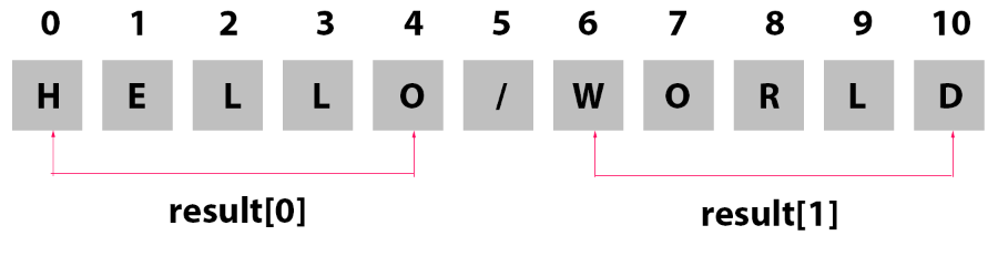 ▼ Sample 문자열 "Hello/World"에서 Sample.split("/")을 통하여 구분자 "/"을 기준으로 문자열을 나누어 result 배열 객체에 각 요소에 담습니다.