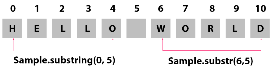 ▼ Sample 문자열 "Hello World"에서 Sample.substring(0,5) 통해 0번째 Index 부터 시작하여 5번째 Index앞까지 해당하는 문자열을 반환합니다. Sample.substr(6,5) 통해 6번째 Index부터 5글자에 해당하는 "World" 문자를 반환하게 됩니다.