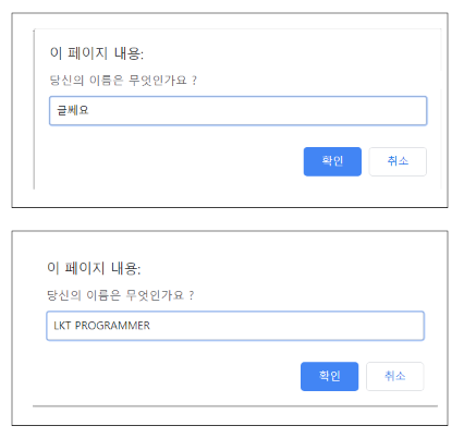위 alert()을 사용하던 방식대로 prompt() 함수도 window를 작성하지 않고 바로 사용할 수 있습니다. 첫 번째는 사용자에게 질의할 내용에 대한 정보이고 두 번째 인자는 질의답변에 대한 default 값을 지정합니다. 아래 샘플 예제를 통해 사용법을 익혀보겠습니다.