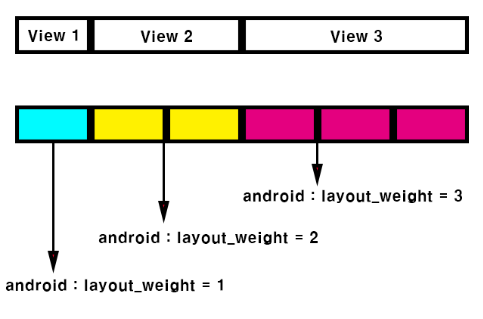 ▼ 상위 View Group 하나와 그 밑에 하위 View 3개로 이루어진 화면입니다. 하위 View의 layout_weight를 각각 1,2,3을 부여하였습니다. 이렇게 되면 각 하위 View들은 1:2:3 비율을 가지면서 뷰 크기 비율을 가지게 됩니다.