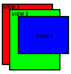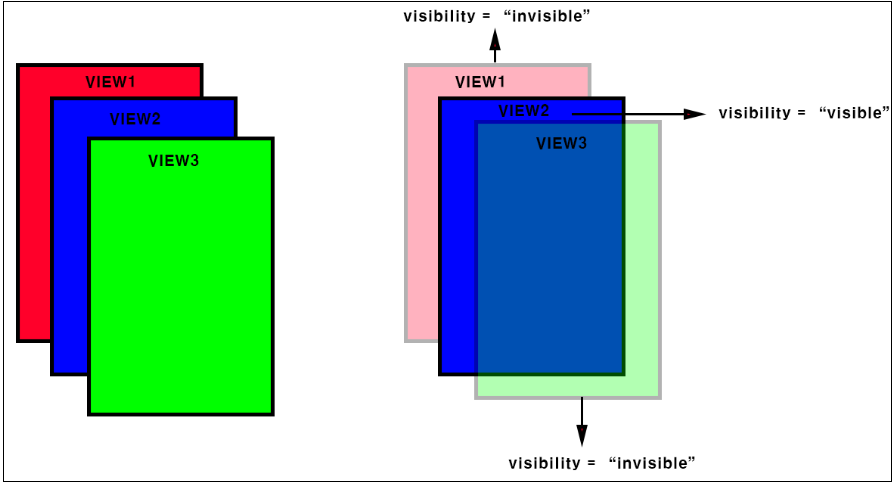 ▼ 위 그림과 같이 중첩된 뷰(View) 중에서 전면에 보이고자 하는 뷰(View)의 visibility 속성을 visible로 설정하고 나머지 뷰(View)들은 invisible로 설정한다면 결과적으로 VIEW2가 전면에 보이게 될 것입니다.