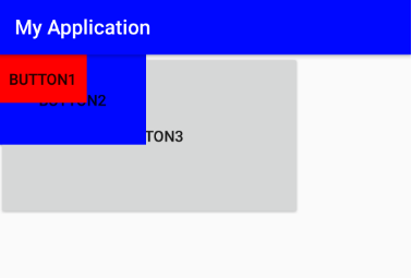 ▼ Red 영역에 해당하는 Button1이 액자로 따지면 가장 나중에 들어간 사진이 됩니다. 화면상에서 가장 전면에 보이는 뷰(View)가 됩니다. 만약 FrameLayout에 중첩되는 뷰(View)들이 크기가 동일하다면 Button1만 화면상에서 표시됩니다.
