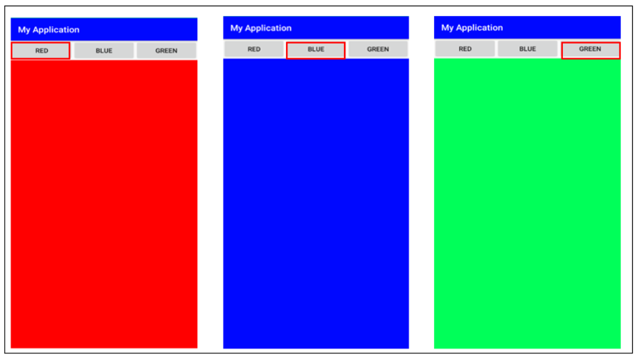 FrameLayout 상에서 여러 뷰(View)가 중첩으로 배치되어 있을 때 전면에 보이는 뷰(View)가 있습니다. 이러한 전면에 보이는 뷰(View)를 소스 상에서 유동적으로 변경되도록 구현해보는 예제를 살펴보겠습니다. 예제는 Button 3개를 구현하고 각 Button을 Click 하면 FrameLayout 전면에 나오는 뷰(View)가 변경되도록 하는 예제입니다.
