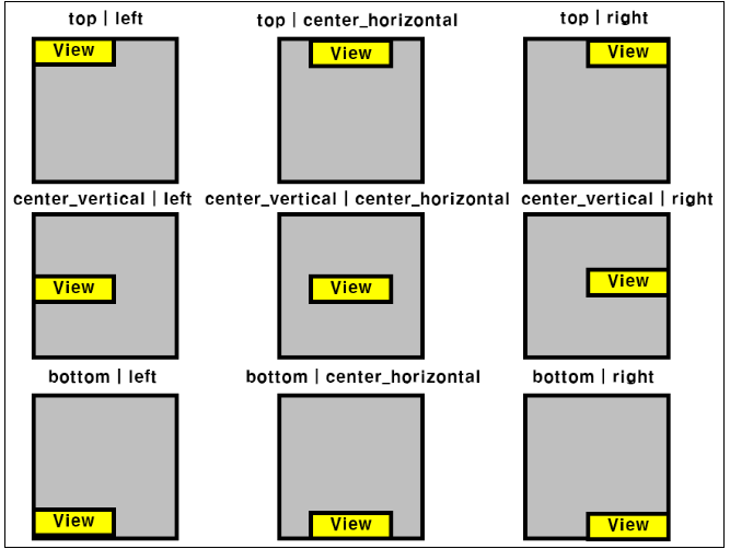 위 예제에서는 Button View들이 모두 같은 곳에 배치되는 것을 확인할 수 있습니다. layout_gravity 속성을 이용하여 배치를 변경할 수 있습니다.