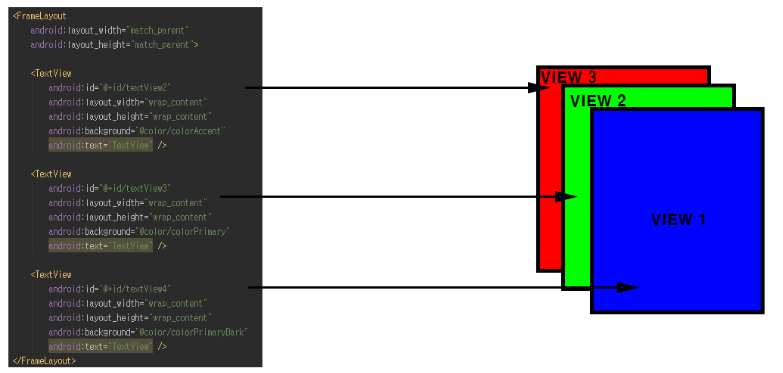 ▼ FrameLayout의 Frame의 '액자'를 의미합니다. '액자'를 FrameLayout과 연관지어 생각해본다면 FrameLayout의 배치기능을 이해하는 데 도움이 됩니다. 액자에 여러 장의 같은 크기의 사진을 끼워 넣는다고 가정을 하였을 때 먼저 들어간 사진의 경우는 나중에 들어간 사진에 의해서 가려져서 보이지 않습니다. 마찬가지로 FrameLayout과 연결시켜 생각해보면 FrameLayout에 여러개의 같은 크기를 가지는 뷰(View)를 배치하였을 때 가장 나중에 추가된 뷰(View)만 전면에 표시가 됩니다. 위 그림에서 보면 VIEW1이 가장 마지막에 추가 된 뷰(View)로 화면상에서 전면에 나오는 뷰(View)가 됩니다. 나머지 VIEW2와 VIEW3의 경우는 VIEW1에 가려져서 보이지 않게 되는 거죠.
