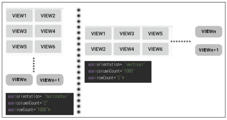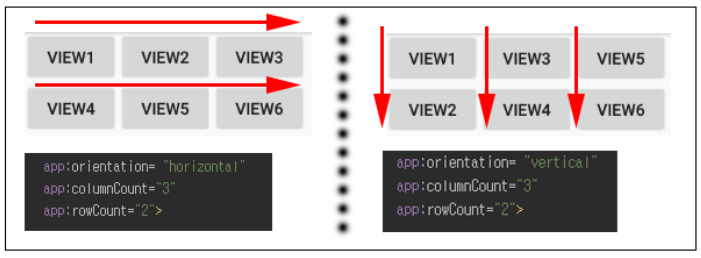 ▼ GridLayout 속성 rowCount와 columnCount를 통해 2x3 형태의 격자 무늬를 가지는 GridLayout입니다. 왼쪽은 app:orientation = "horizontal" 지정함으로써 자식 뷰(View)들을 수평 방향으로 배치하고 있습니다. 오른쪽은 app:orientation = "vertival"을 통해 자식 뷰(View)들을 수직 방향으로 배치하는 것을 확인할 수 있습니다.