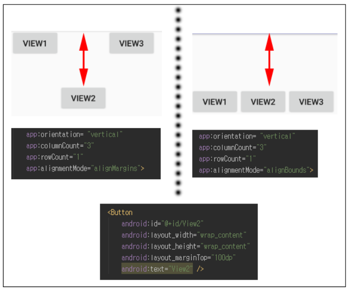 alignmentMode 속성은 자식 뷰(View)들을 정렬할 때 기준이 되는 뷰(View)의 여백을 포함하여 나머지 뷰(View)들을 정렬할지를 결정하는 속성입니다. 이때 기준이 되는 뷰(View)란 가장 큰 너비 혹은 높이를 가지는 뷰(View)를 의미합니다.
