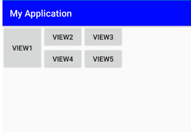 ▼ 3x2 GridLayout을 배치하고 그 아래 뷰(View) 다섯 개를 배치한 형태입니다. 첫 번째 뷰인 VIEW1의 layout_columnspan = "2" 를 지정함으로써 열 두 개를 병합하도록 하였습니다. 결과화면에서 VIEW1이 셀 2개를 병합한 형태로 배치되는 것을 확인할 수 있습니다. 다음은 row_span입니다.