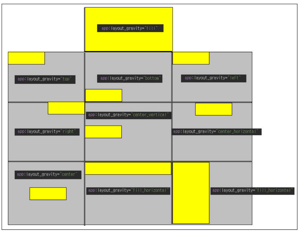 layout_gravity 속성은 다른 레이아웃 공부를 하면서 익숙하게 봤던 속성입니다. GridLayout의 자식 뷰(View)들이 가지는 속성인 layout_gravity 속성을 통해 해당 자식 뷰(View)가 셀의 어느 위치에 배치될지를 결정할 수 있습니다. 속성값별로 배치되는 영역은 아래를 참조 바랍니다.