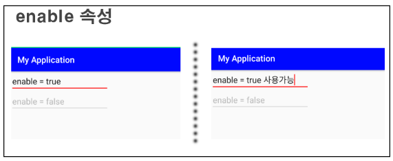 부모 클래스로부터 상속받은 속성 중 enabled 속성을 사용하면 EditText에 텍스트를 입력 및 수정이 불가능한 상태로 설정할 수 있습니다. default 속성값은 true로 사용 가능한 상태이며 false로 지정하게 되면 EditText를 사용할 수 없는 상태가 됩니다.