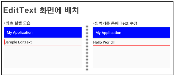 안드로이드 에디트텍스트(EditText)는 TextView로부터 파생된 클래스로 TextView는 단순히 Text를 보여주는 역할을 한다면 EditText는 Text를 입력 및 수정까지 가능한 뷰(View) 위젯입니다.