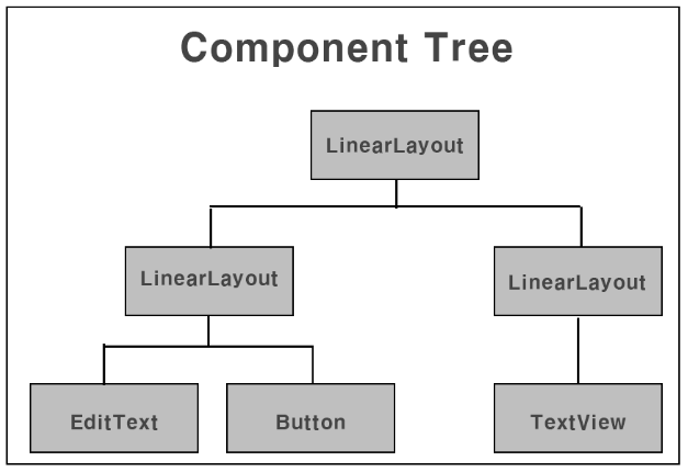▼ 레이아웃은 간단합니다. 최상위에 수직 LinearLayout을 배치하고 그 밑에 수평 LinearLayout 2개를 배치합니다. 첫 번째 수평 LinearLayout 밑에는 EditText와 Button을 배치하고 두 번째 LinearLayout에는 TextView를 배치하였습니다.