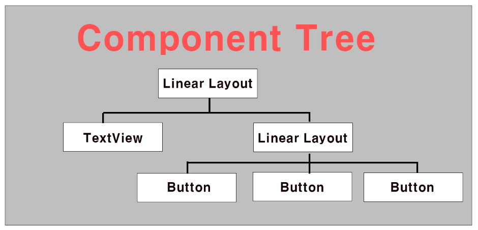 버튼 이벤트 처리에 대한 예제는 동일한 기능을 수행하는 App을 기반으로 하여 다양한 이벤트 처리 방식을 보여주고자 합니다. 아래는 예제로 사용할 레이아웃 리소스 xml과 Component Tree 입니다.