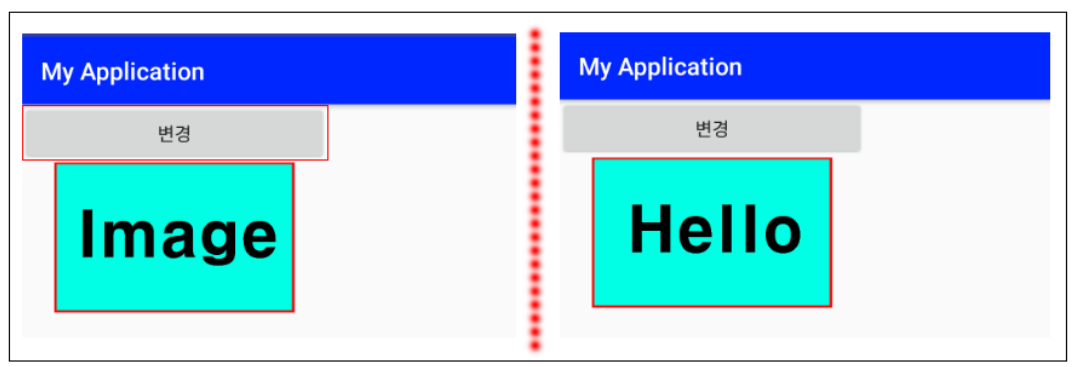 ▼ Button이 클릭되었을 때 Layout 리소스상의 ImageView 참조 객체를 먼저 받아옵니다. 그런다음 변경하고자 하는 이미지의 리소스 ID를 사용하여 setImageResource() Method를 통해 이미지를 변경합니다.