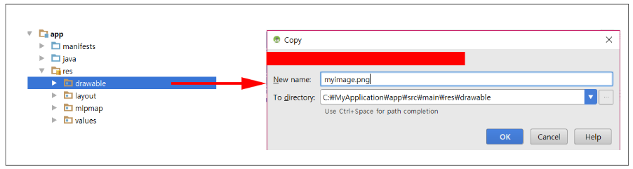 ▼ 파일을 복사하기를 하면 이름을 지정하라고 합니다. 이때 지정하는 이름은 확장자를 제외한 이름이 리소스 ID로 지정되며 특수문자나 대문자 사용을 피해서 적절한 Image 이름을 지정해줍니다.