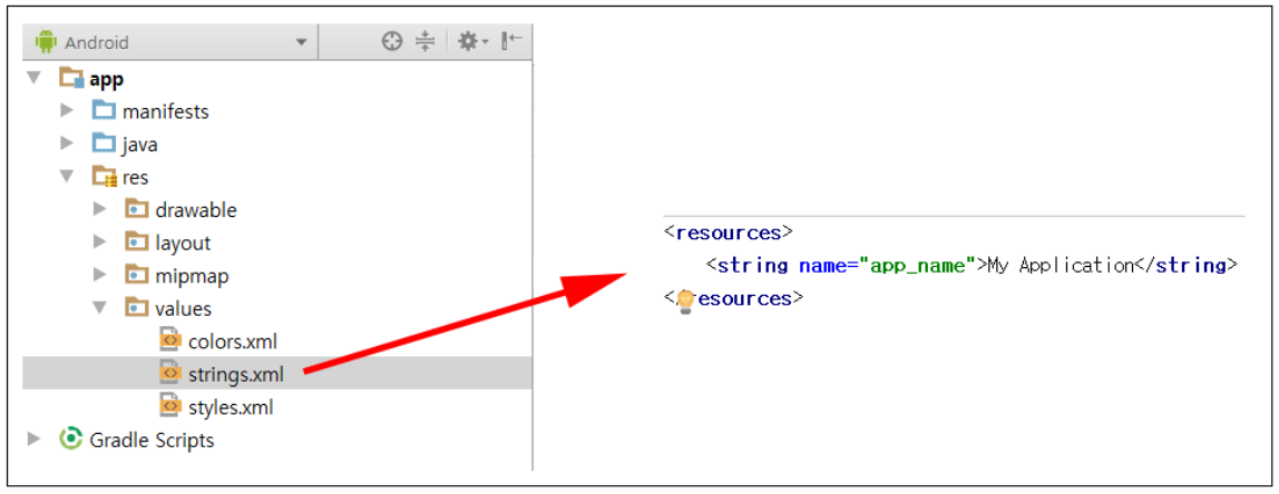 안드로이드 프로젝트를 생성하게 되면 /res/values/ 경로 아래에 strings.xml이라는 xml 리소스 파일을 확인할 수 있습니다.
