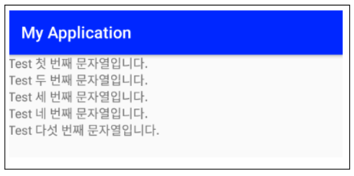 ▼ mainActivity 클래스는 TextView를 참조할 수 있는 변수 5개를 가지고 멤버 변수로 InitializtView Method와 setTextView() Method를 가집니다. InitializeView() Method는 레이아웃 리소스에서 정의했던 TextView들의 참조 객체를 얻어오는 함수입니다. 다음 setTextView() Method에서 리소스 파일에 정의된 문자열 리소스를 가져와 TextView의 Text에 지정합니다