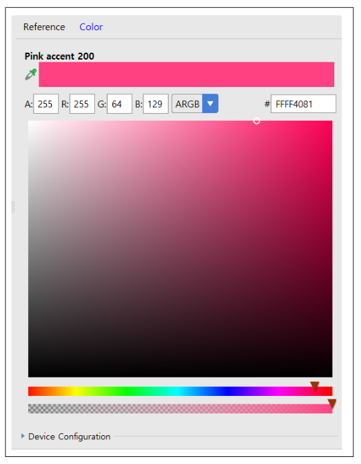 안드로이드 스튜디오에서 Color Palette에서 원하는 색상값을 얻을 수 있습니다. xml 레이아웃 리소스에서 design Tab의 속성 창에서 Resource를 속성 값을 지정 가능한 속성의 우측에 보면...이라는 아이콘을 클릭하면 Pick a Resource 창을 열 수 있습니다.