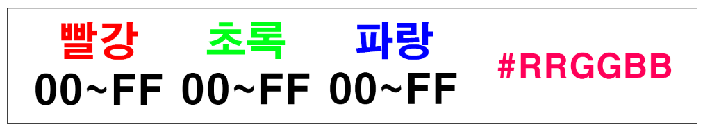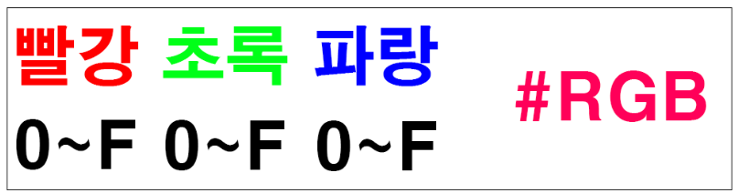 ▼ #으로 시작하며 RGB에 해당하는 각 색상을 0~15까지 16진수로 표현된 값으로 표현합니다. 예를 들어 빨강을 표현하고 싶다면 #F00 같이 사용하면됩니다.