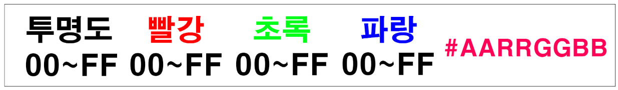 ▼ 3번째 형식에서 투명도 값이 추가된 형태입니다. 투명도 값도 0~255까지 수치 값으로 표현할 수 있고 수치 값이 높을수록 불투명해집니다.