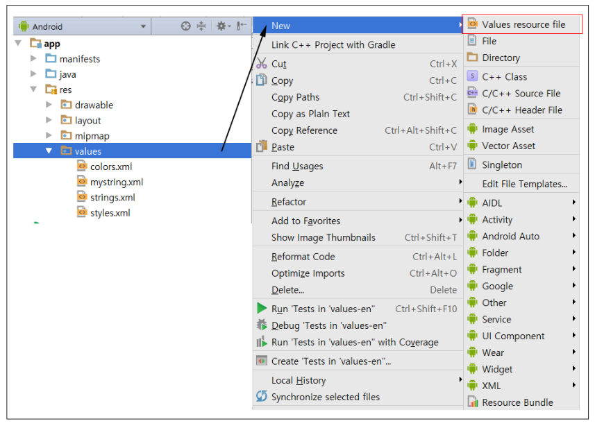 ▼ Color Resource는 /res/values/ 경로 아래에 xml 리소스 파일에 추가합니다. 프로젝트를 생성하면 default로 생성되는 colors.xml 안에 추가해도 되지만 /values/ 경로밑에 새로운 xml 리소스 파일을 생성하여 그 안에 리소스를 추가해도 됩니다. values 폴더를 우클릭하고 [New]-[Values resource file]을 클릭하고 원하는 파일 이름을 지정하고 OK를 클릭합니다. 저는 mycolors.xml로 xml 리소스 파일을 생성하였습니다.