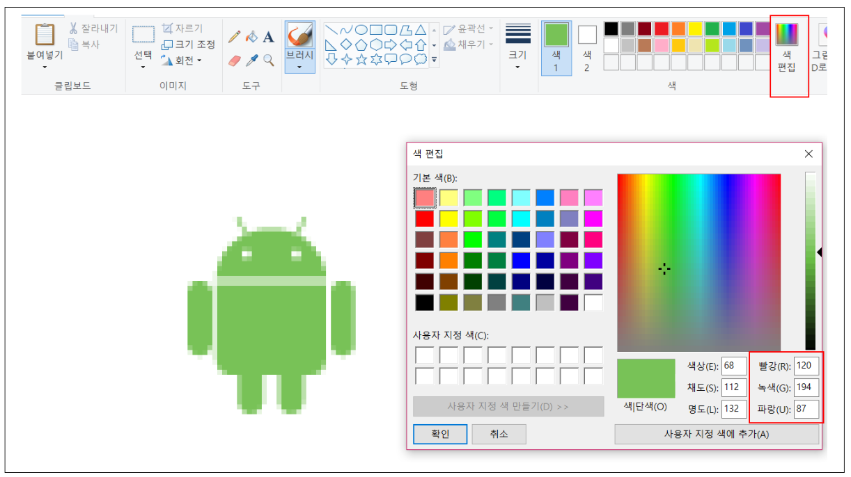 색상 표현 방식은 알았지만 리소스로 추가하고자 하는 색상의 RGB 값을 모르면 난감합니다. 이번에는 간단하게 그림판을 통해 원하는 RGB 색상 값을 추출하는 방법을 살펴보겠습니다.