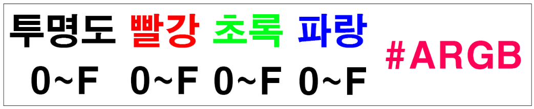 ▼ 위 형식에서 마찬가지로 각 색상값이 0~15까지의 16진수 값을 가지는데 투명도 값이 추가된 형태입니다. 투명도도 0~15까지 16진수 값을 가지며 수치가 커질수록 불투명해집니다.
