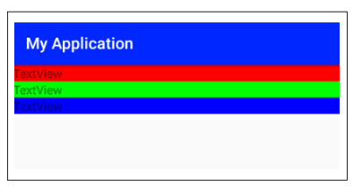 ▼ TextView 3개를 배치하고 background 속성을 우리가 추가했던 색상 리소스를 참조하여 지정하는 예제입니다. 색상 리소스를 참조하여 속성값으로 지정할 때는 "@color/리소스 ID"형식으로 지정합니다.