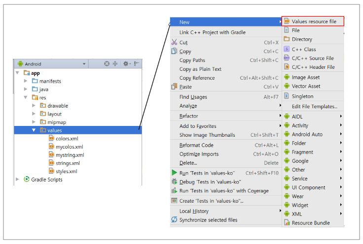 ▼ values 폴더를 우클릭하여 [New]-[Values resource file]을 클릭합니다.