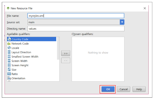 스타일 리소스는 레이아웃 리소스와는 별개의 xml 파일에 추가합니다. /res/values/ 경로밑에 xml 리소스 파일을 추가하고 파일 이름은 자유롭게 지정하되. xml 확장자를 가지도록 합니다.