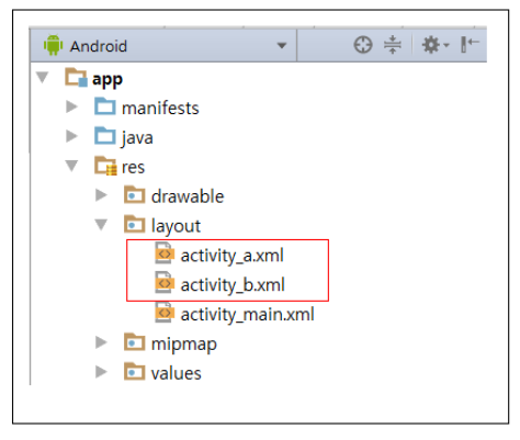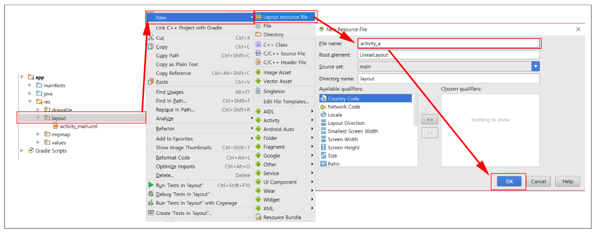 ▼ /app/res/ 경로밑에 layout 폴더를 우클릭하여 [New]-[Layout resource file]을 클릭하고 파일 이름을 activity_a로 지정하고 OK 버튼을 클릭합니다. 마찬가지 방식으로 B 액티비티의 레이아웃 리소스 파일도 생성해줍니다. 파일을 정상적으로 추가하면 아래와 같이 /res/layout/ 경로 밑에 activity_a.xml과 activity_b.xml 파일이 생성되는 것을 확인할 수 있습니다.