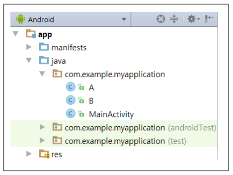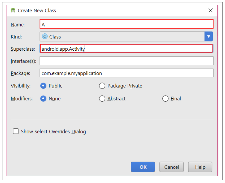 ▼ 클래스(Class) 이름을 지정하고 Activity를 상속받아 onCreate() 함수를 구현해주기 위해 SuperClass 입력란에 Activity를 입력하고 OK 버튼을 클릭합니다. 마찬가지 방식으로 B 액티비티 실행을 위한 클래스 파일을 생성하게 되면 아래와 같이 클래스 파일이 생성됩니다.