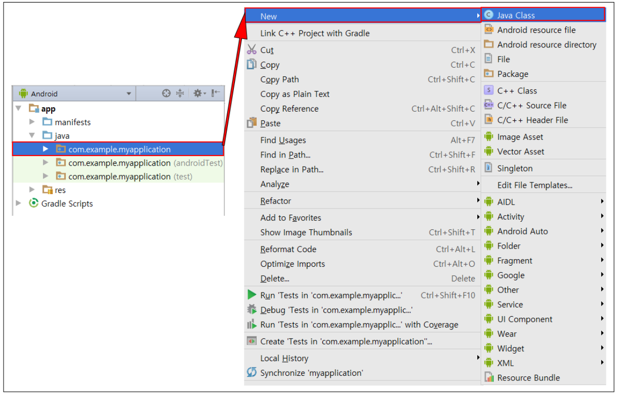 ▼ Activity를 실행하기 위해서는 Activity Class를 상속받아 onCreate() 함수를 오버 라이딩하는 Class를 생성해야 합니다. [New]-[Java Class]를 클릭합니다.