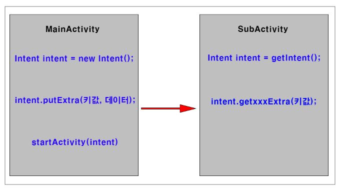 ▼ MainActivity에서 SubActivity를 실행하면서 데이터를 전달하는 대략적인 프로세스를 나타내는 그림입니다. MainActivity에서는 액티비티를 실행하기 위해서는 먼저 Intent 객체를 생성합니다.