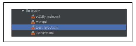 다음으로 Toast에 지정할 레이아웃을 생성하여 toastLayout이 참조하도록 하고 setView()를 통해 Toast의 레이아웃을 지정합니다.