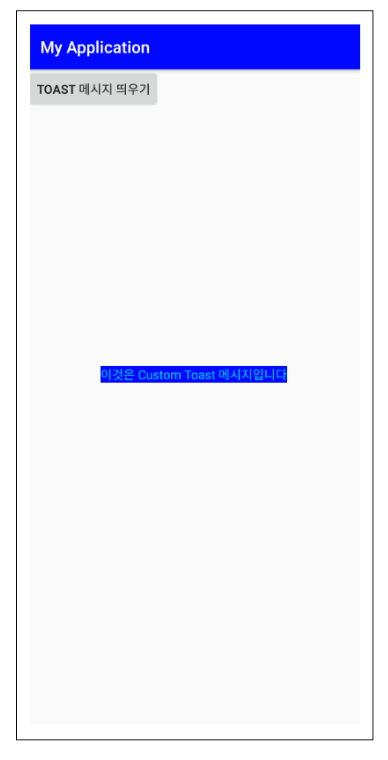 makgeText() 함스의 리턴값인 Toast 객체를 myToast를 통해 참조하도록 하고 show() 함수를 통해 Toast 메시지를 띄울 수 있습니다. 만약 Toast를 따로 커스텀하지 않는다면 아래와 같이 참조 객체를 지정하지 않고 사용이 가능합니다.