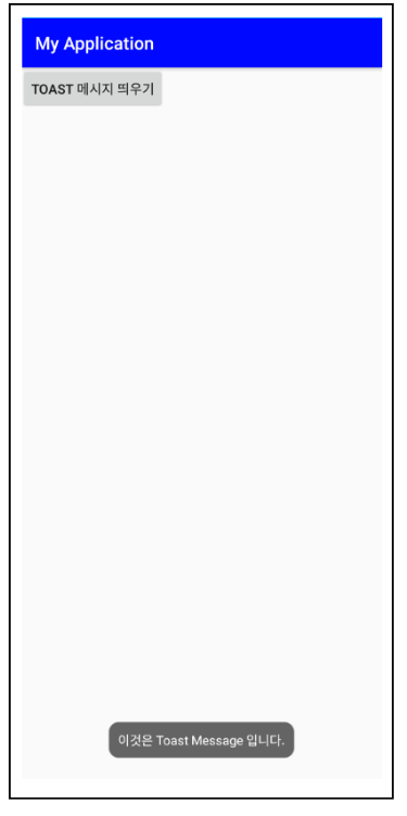 Toast.makeText(this.getApplicationContext(),"이것은 Toast 메시지입니다.", Toast.LENGTH_SHORT).show();