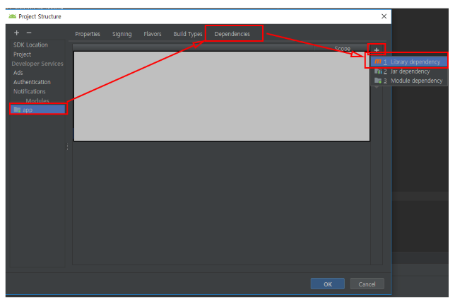 ▼ [app]-[Dependencies] Tap 항목에서 우측에 [+] 마크를 클릭하여 Library Dependency를 클릭합니다.