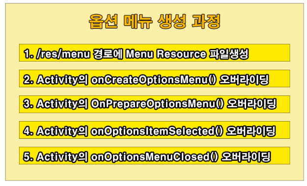 Lkt_Programmer 2019. 5. 29. 12:02안드로이드에서 옵션 메뉴(Option Menu)는 앱의 우측 상단에 배치되는 메뉴키를 통해 동작시킬 수 있습니다. 옵션 메뉴(Option Menu)는 리스트 형식의 다이얼로그로 여러 개의 메뉴 항목을 추가할 수 있고 각 메뉴 항목은 하위 메뉴를 포함하는 것도 가능합니다.