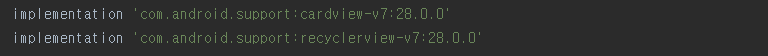 ▼ build.gradle 파일에 RecyclerView와 CardView를 사용하기 위해 위와 같이 라이브러리를 추가합니다.