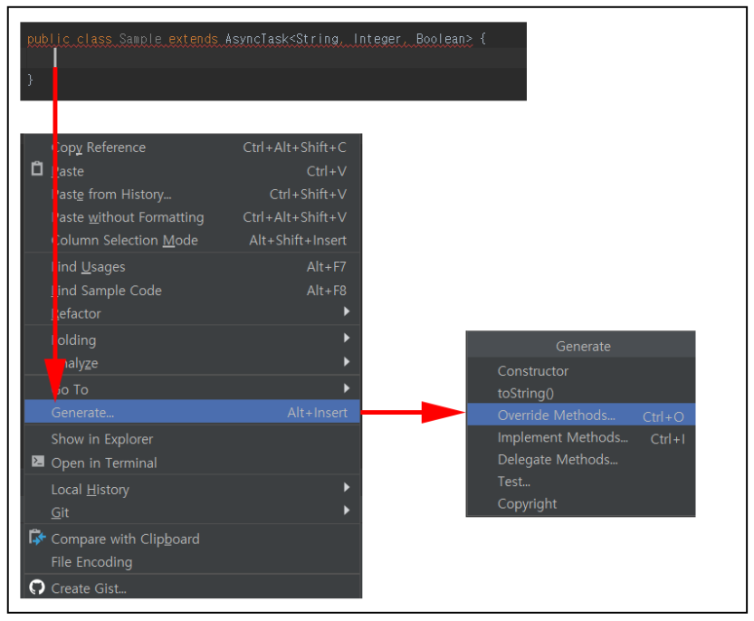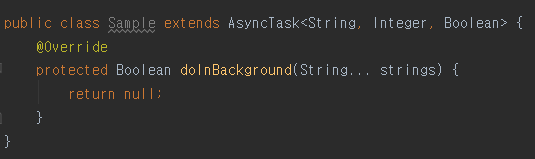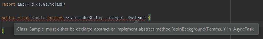 ▼ Sample 클래스는 AsyncTask 라는 추상클래스를 상속받는 클래스입니다. 그런데 안드로이드 스튜디오에서 오류로 처리하고 있는데 이유는 AsyncTask를 상속받으면 반드시 재정의 해야 할 함수를 구현하지 않았기 때문입니다. 지금같은 경우는 오류를 살펴보면 doInBackground() 함수만 재정의해주면 됩니다. 만약 재정의 해야 할 함수가 많다면 일일이 개발자가 코드를 입력해야합니다.