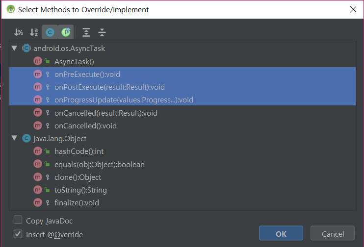 ▼ 그러면 위와 같이 창이 하나가 활성화됩니다. AsyncTask 추상 클래스를 상속받으면 반드시 재정의해야 할 함수 목록을 보여주는 화면으로 자동 코드를 추가하고자 하는 함수를 선택 후 OK 버튼을 클릭합니다.