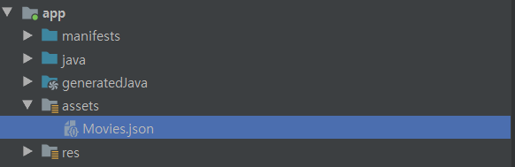 ▼ Json 파일은 /app/assets/ 경로 아래에 위와 같이 추가합니다. 만약 assets 폴더가 없다면 app 폴더를 우클릭하여 [new] - [Folder] - [Assets Folder]를 클릭하여 폴더를 먼저 생성해줍니다. 폴더가 생성되면 assets 폴더를 우클릭하여 새로운 파일을 생성하고 확장자는. json으로 하여 생성해줍니다.