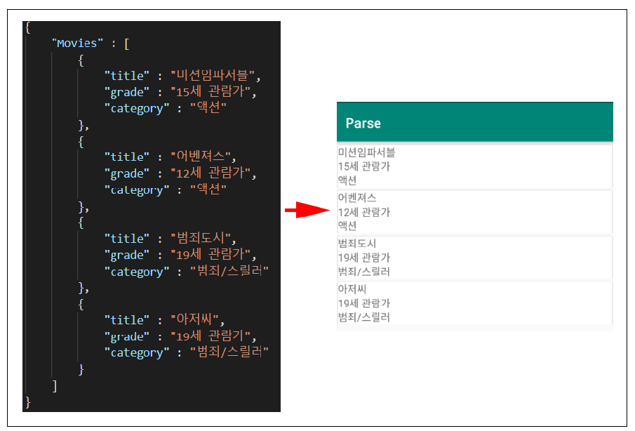 ▼ 영화 정보를 포함하는 Json 형태의 데이터 포맷을 파싱 하여 안드로이드 앱에서 List 형식으로 보여주는 예제를 살펴보겠습니다.