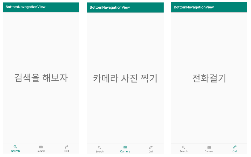 ▼ 앱의 화면은 크게 두 가지 영역으로 나눕니다. 하나는 포스팅의 주제인 BottomNavation 영역이며 해당 영역에는 앱의 컨텐츠 탐색을 위한 세 가지 메뉴인 검색 영역, 카메라 영역, 전화 걸기 영역이 들어갑니다. 사용자가 각 메뉴를 클릭하였을 때 그에 맞는 Fragment를 FrameLayout에 배치합니다.