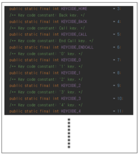 KeyCode는 KeyEvent 클래스에 정의된 상수들 중 하나로 수많은 Key와 대응됩니다. 예를들어 뒤로 가기 버튼을 눌렀을 때 KeyCode는 KeyEvent.KEYCODE_BACK 값이 되며 홈키를 눌렀을 때는 KeyEvent.KEYCODE_HOME 값이 됩니다. 자신이 특정 키에 대한 이벤트 처리를 하고 싶을 경우 해당 키와 대응되는 KeyCode 값을 알아야 합니다. 해당 내용이 있는 참조 문서는 포스팅 아래에 추가하였으니 참조 바랍니다.